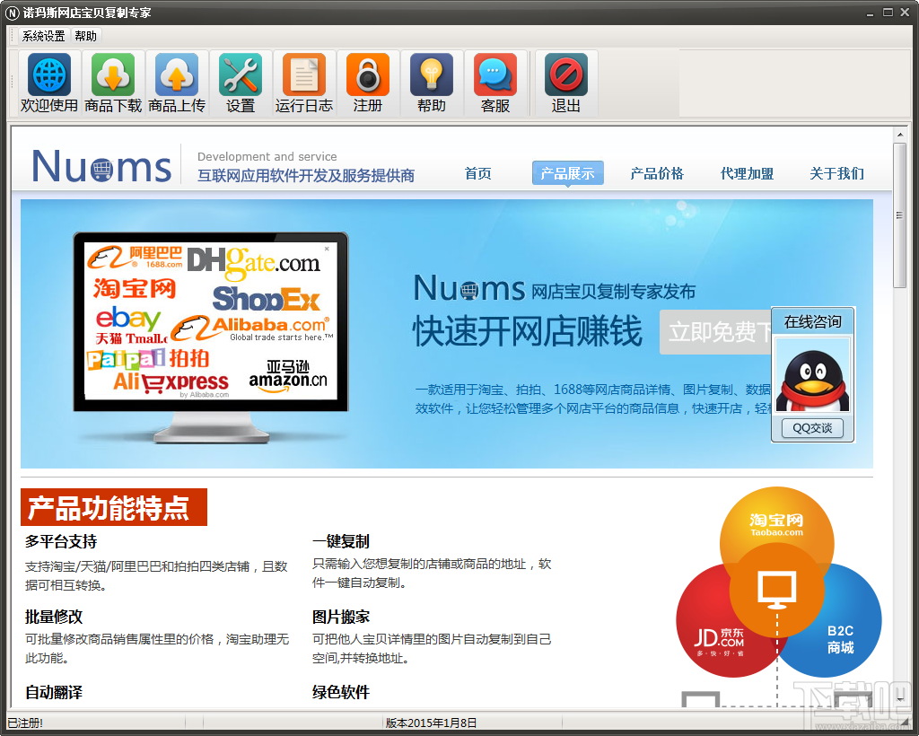 是一款高效的商品复制软件,链接京东、淘宝、亚马逊、阿里巴巴、ECShop、速卖通等16个平台,轻松解决网店商品名称、图片、价格、描述等信息的复制和编辑。产品简单易用、性能卓越,让您可以快速把产品发布到多个平台。