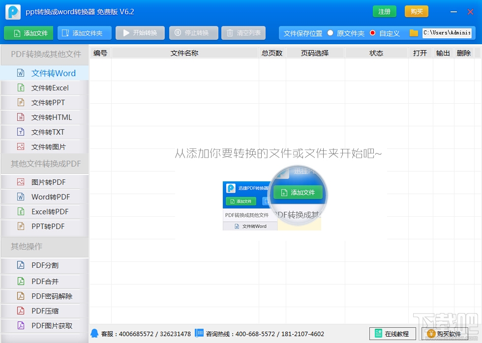 使用方法: 1、选择转换模式。文件转换器软件目前支持八大转换模式,包括常见的文件转Word、文件转换Excel、文件转图片等,点击图标勾选即可。 2、添加文件。点击文件转换软件的“添加文件”按钮,将ppt文件添加到程序界面,软件支持添加多个ppt文件。 3、输出选项。文件转换器软件默认将转换出来的文件保存在原文件夹内,或者自定义文件夹存储路径,最后点击上方“开始转换” 即可顺利完成转换。