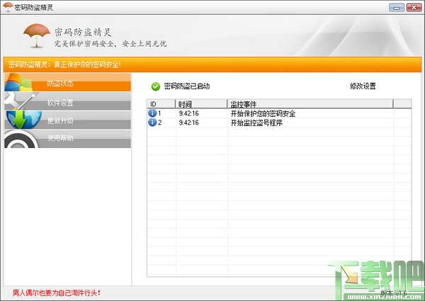 密码防盗精灵是一款保护电脑安全,防止密码泄流的防止盗号软件。密码防盗精灵正保护你的密码安全,防止盗号。可用于保护qq密码、msn密码、各种网游密码,以及对一切输入口令、密码的地方提供保护。