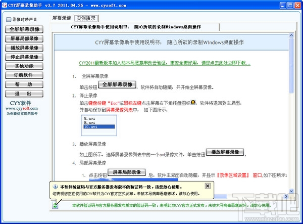 CYY摄像头录像助手是一款用于摄像头录像的免费软件 录像压缩比是摄像头附带软件的录像的 100倍以上!!! 压缩比率测试报告 具有自动保存功能,可用于快速的QQ视频录制 新增摄像头照相功能 2.2新增功能:1)Fix Bug:带声音录像时,引起的不兼容问题2)处理文件夹路径//问题3)把不常用的功能按钮放入‘其他功能’中