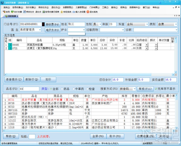 一、系统特点:1、 采用主流客户/服务器(C/S)体系结构,具有高效性、可靠性,大型关系型数据库使数据更安全、更稳定。2、 操作界面友好统一,具有较强的可操作性,一般操作人员只要经过几天的培训,即可上岗;3、 收费项目的输入全部采用每个汉字的五笔码或汉语拼音首码,并支持模糊匹配,录入更方便快捷;4、 强大的查询、统计、报表功能,可以查询统计收费员下班结算单、住院病人一日清单、住院费用明细、科室收入汇总、医生工作量、门诊、住院日报表等,药房、药库进销存,报表支持自定义,满足各种自定义报表格式。5、 模块化结构,可自由组合,具有可剪裁性和可伸性,能适应不同规模医院的需求。帮助客户优化管理,用的容易。超级用户:AMD 密码:1