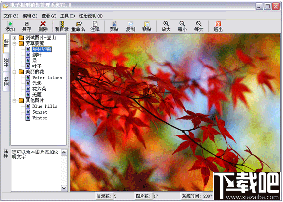 国内第一个具备销售功能的电子相册系统;>使用说明:>理解了以下3个密码的概念,您就可以顺利使用本系统:>1、超级管理员密码-->超级管理员密码是电子相册高到权限控制密码,用超级管理员密码进入系统后,您可以对电子相册拥有高到管理权限;电子相册默认的超级管理员密码为空>2、分发访问密码-->您可以将电子相册分发给您的客户浏览,并为客户创建一个访问密码,用访问密码进入电子相册后,只能进行浏览,其他权限会被限制。分发访问密码只能由超级管理员创建,密码与用户的机器绑定,每台机器的访问密码都是不同的>3、目录访问密码-->可以单独为某个图片分类目录设置密码,只有输入目录访问密码才可以访问加密的目录>>具体使用方式很简单,您可以分类管理图片文件,可以添加删除图片,也可以拖动图片;并且您也可以销售您的电子相册,根据用户机器码 为其创建访问密码;为用户升级电子相册也非常方便,只需要将新的相册数据库发给用户就可以;>>本系统为谁设计?>第一类应用场景--电子相册销售:>你收集了很多漂亮的图片想进行销售,但却为无法控制非法传播而苦恼着,利用《电子相册销售管理系统》可以为不同用户创建不同的访问密码,密码与用户机器绑定,用户无法传播您的电子相册>第二类应用场景--私人相册: >本电子相册除具备销售功能外,本身也是一个强打的电子相册管理系统,可以分类管理您的私人图片,支持批量导入、拖拽、无级分类、设置访问密码等功能>相册销售分发方式:>将PicSale2.0.exe和Picdrm.pdb文件发给用户,用户执行PicSale2.0.exe文件,输入您给他创建的访问密码就可以进入,用访问密码进入电子相册,只能进行浏览,无法另存、添加、删除图片等操作>为用户升级相册的方式:>将您新的相册包Picdrm.pdb发给用户就可以;