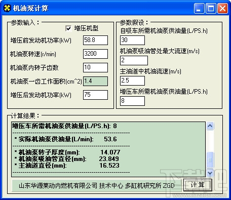 机油泵计算是一款计算机油泵的绿色小软件,参数输入:增压前发动机功率、机油泵转速、机油泵内转子齿数、机油泵一齿工作面积、增压后发动机功率,最后得出计算结果