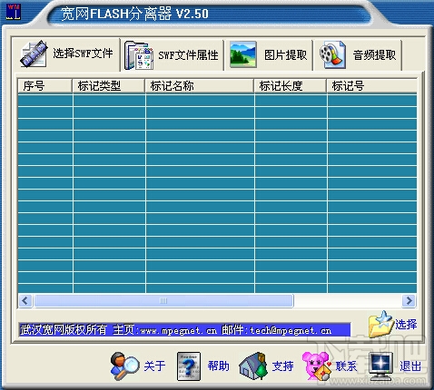 宽网FLASH分离器是武汉宽网开发用于对FLASH文件中的图片及声音进行提取并分离等的免费绿色工具软件,同时该软件实现对FLASH文件的图形提取功能,并实现按照任意尺寸保存为BMP、JPG、GIF等格式文件,同时提供对MP3/WAV声音信息提取并实现MP3、WAV、EXE等文件格式方式保存等功能,是一个非常有效的FLASH提取工具。