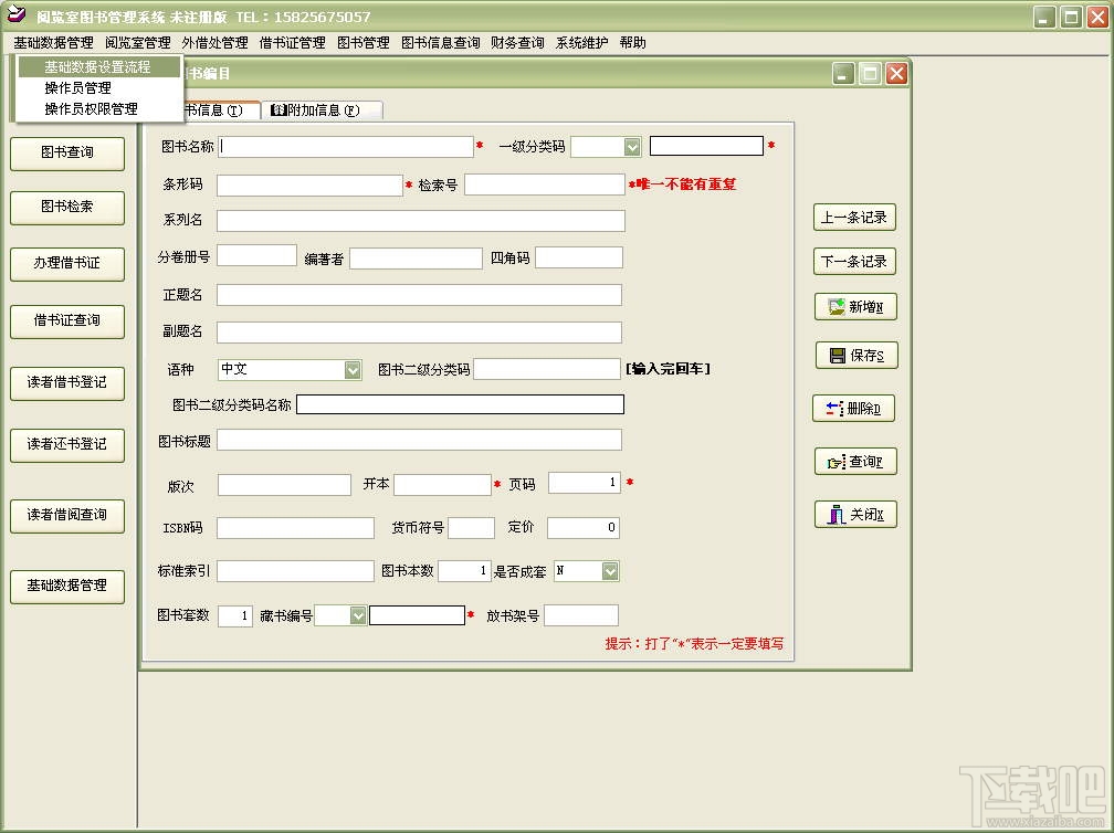 图书室管理信息系统界面友好、功能强大、操作简单、精巧细腻、运行稳定、自动化程度较高,能充分满足中、小型图书室的日常管理需要。数据管理:图书、读者、借书和还书等信息的录入、修改与删除,自动进行应还日期、超期天数、罚款金额的计算。数据查询:图书、读者、借书和还书等信息的模糊查询、报表打印、图书条形码标签打印、读者借书证打印、快速数据导出。统计排行:图书、读者的借阅排行和分类排行统计,并可以设置统计排行日期范围、排行范围。今日盘点:今日借出、归还图书,今日登记图书、读者,到期、超期读者,罚款统计。系统管理:图书类别、出版社名称、读者类别、借书天数、借书本数、罚款金额、背景图片、自动备份、用户权限、网络环境的设置,以及日志记录和数据清理功能,同时支持条形码扫描枪输入和外部数据快速导入。本软件功能详尽,是各类图书资料管理方面工作的理想选择。(初始用户与密码:administrator)。