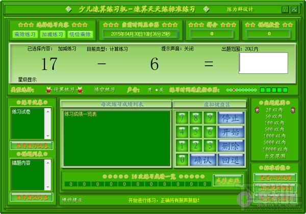 2、无需家长监督检查孩子练习数学计算题也能快速提高孩子的速算能力,操作简单,孩子很快就能掌握它的使用方法,每次练习后,都将自动把启动的时间,退出的时间,练习的内容、范围自动储存下来,也能将练习的试卷保存起来,供家长们参考,为家长们节省了大量的时间,当孩子使用软件的次数过多时,软件会自动提示让孩子休息,界面以图形化按钮的形式,采用随机出题的方式,题量无穷无尽,使用“星级显示的方式,直接判断儿童速算的能力,即能使用小键盘输入,又能使用鼠标输入,还有精美的模拟按键操作,具备了软件的趣味性,能够产生无数的计算题与填空题,除了固有的设定20、100、1000、10000以内的出题范围以外,还可自行设置出题范围。加减乘除随意设置,家长们忙完别的事后,回来启动该软件,就能知道孩子在此之前每次练习的成绩情况,同类软件的性能发挥得淋漓尽致。