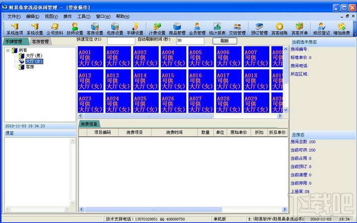 一、适用对象: 财易桑拿洗浴管理软件适用于,酒店,宾馆,洗脚城,桑拿城,洗浴城,洗脚城等桑拿洗浴行业,是目前市面上较好的桑拿洗浴管理系统软件。 版本比较: 标准版相比普及版:多出商品采购管理、仓库库存管理,员工管理、会员管理等功能模块。 二、主要功能: 前台收银管理: 前台开台点菜,增加消费,计价结帐,支持签单,挂账等多种结算方式。 预订管理: 预定餐桌,可以灵活设置保留时间。 营业统计: 统计餐桌在店消费情况,查看日营业额度,月营业额度。 商品管理: 商品资料设置,采购进货,采购退货,库存管理,菜品管理。 系统管理: 用户设置,权限管理,数据库备份恢复。 员工管理系统: 员工领用,员工考勤等信息,员工分组设置,员工基本信息设置。 会员管理系统: 会员缴费充值,会员积分,会员卡类型设置,计次卡,储值卡等。 技师管理: 支持技师排班管理,营业分析: 员缴费储值,会员消费,会员积分管理,往来单位管理,财易桑拿洗浴管理软件为桑拿洗浴业经营者提供了成本分析,利润分析,物流管理等诸多功能,能广泛适用酒店桑拿洗浴管理,饭店桑拿洗浴管理等场合。软件提供了方便的数据查询功能,也可将各类数据转化为Excel文档 报表统计及打印 系统设置等功能。 三、财易桑拿洗浴管理软件独家特色功能: 1.库存盘点时,支持库存自动盘点,支持从Excel批量导入盘点信息【独家】。 2.开单时,支持从Excel导入商品资料信息【独家】。 3.商品资料设置:分组和商品资料在同一界面,所见及所得的树形界面【独家】。 4.录入商品资料,支持拼音码,中文汉字,编码等模糊输入模式,支持手工查找输入模式,支持条码扫描模式【独家】。 5.众多自定义特色功能,自定义表单录入界面,自定义显示界面【独家】。 6.自由组合设置查询组合条件查询【独家】。 7.唯一一款真正意义上可用的导入功能,初始化时可以很方便的导入商品资料、客户资料。 8.可自己设置单据号格式,客户编码,商品编码格式。