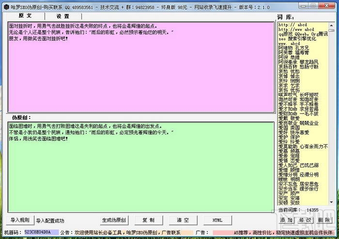 本软件是一款免费的专业伪原创工具,专门针对谷歌、百度、雅虎、ASK等大型搜索引擎收录设计,通过伪原创工具生成的文章,会更好的被搜索引擎收录和索引到。 本伪原创软件是网络编辑,群发用户以及SEOER的利器,也是网站优化工具中不可多得的利器。