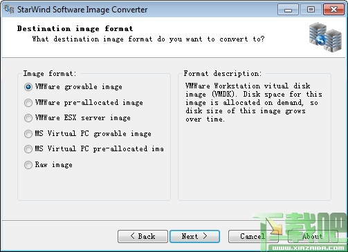 StarWind Converter(StarWind V2V Converter)是一个很另类的格式转换软件,可以实现VMWare和Microsoft Virtual PC镜像格式的互转,即将VMDK转换为VHD、或将VHD转换为VMDK,或转为StarWind的原生IMG格式,这样就方便在虚拟机产品间的移植。