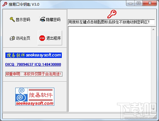 搜易口令钥匙(SeeKey)是一款全免费查看本机电脑上各种口令密码如上网帐号密码、信箱密码的软件。采用拖动查看方式可以将任意程序所有带*号字符的密码识别出来。软件用于遗失密码时使用,不得用于非法用途。