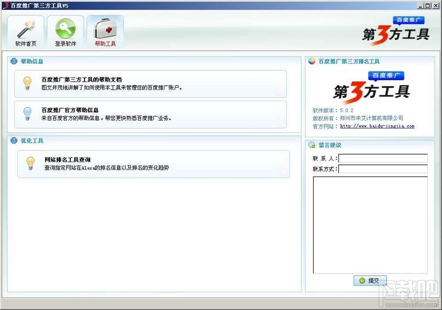 百度推广第三方工具1.智能推广、监控排名——节省人力,不必呆板的时刻关注百度后台。用户只需要在软件里设置一些基础参数,即可启动智能推广、监控排名功能。根据您设定的规则,软件会时刻更新数据,随时以最合适的价格为用户争取到最优质的排名位置。软件也会根据您设置的参数以及实时统计的排名、点击数据,自动为您提示出推广信息中存在的一些不合理因素,便于您及时修改调整推广策略,达到优秀的推广效果。2。智能出价、节省投入。本软件独创的智能出价功能,会按照您设置的逐级加价(减价)参数,为您判断出最合理的竞价价格锁定排名。比竞争对手多投入一分钱,也许就可以使您的排名在他之上。投入最少的资金,占据最有优势的排名位置,可以为用户节约至少10%的推广费用。花小钱办大事,把“性价比”发挥到比较大化! “助力搜索,供应商机”一直是我们所追求的终极目标。 “百度推广第三方工具(2010凤巢专业版)”是独方于百度的第三方公司针对百度竞价排名服务所开发关键词竞价排名工具。使用本软件管理您百度竞价排名的账户,大幅提高效率,优化竞价排名效果。更重要的是,可以使用独具特色的自动化功能,实现自动出价、自动锁定排名、均匀分配费用等功能,使您能够全方位的落实推广策略达到优秀效果。 此版本(凤巢专业版5.0beta)为国庆特别测试版,在2010-10-01至2010-10-31日期间下载使用软件,并且提交相关建议和BUG信息的用户,为表示真切的感谢,我们将免费为您延长15天试用时间。