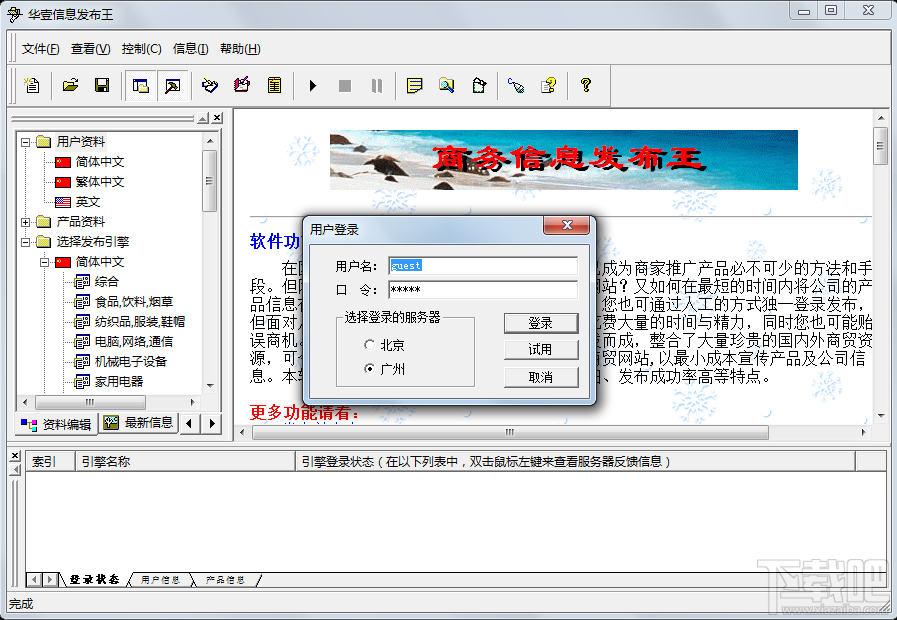 自动发布供求信息至国内国际各商贸网站。在国内外著名商贸网站发布产品供求信息,已成为商家推广产品必不可少的方法和手段。但网络资源庞大,如何才能了解到这些商贸网站?又如何在最短的时间内将公司的产品信息在这些商贸网站上发布以抢占先机?当然,您也可通过人工的方式登录发布,但面对几千个商贸网站发布信息,手工方式则需花费大量的时间与精力,同时您也可能贻误商机。华壹信息发布王经专业人员研究开发而成,整合了大量珍贵的国内外商贸资源,可令您的产品信息在几分钟内遍布全球各大商贸网站,以最小成本宣传产品及公司信息。本软件具有搜集网站多、专业性强、分类详细、发布成功率高等特点。