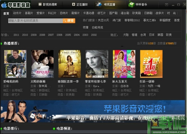 苹果影音盒是一款功能强大的绿色影视播放器,软件纯净无广告,每天更新大量电影和电视剧,目前已经汇聚了2万部高清电影、电视剧、动画等,全部DVD画质音效,随点随看,时间自由掌握,具有视频搜索、在线播放、视频加速等功能,支持数CNTV较好的直播网络电视台,可收看NBA、足球直播赛事,新的综艺影视节目,是您看影视装机必备工具。新更新DJ音乐频道。令您HI到极点!