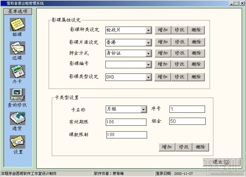 《雪莉音像出租管理系统》 是一套面向广大中小音像出租店的计算机管理系统。作者根据中小音像出租店的情况,合理设计了这套音像出租系统,使音像出租的手工操作改为计算机管理,极大的减轻了音像出租者的负担,使繁琐的工作变得简单。