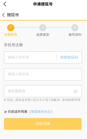 3、这里可以在已申请搜狐号的页面里填写好手机号,账号注册类型和个人资料详情,这里等待客服审核通过,就可以发表视频。