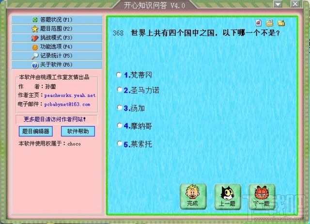 本软件是一款别俱特色的智力问答游戏,内容涉及到历史,经济,风情,民俗、地理、人文等多个古今中外各方面的知识,多达两万多题,并在不断扩充。让您在轻松娱乐,益智,搞笑的时候,不知不觉的增长知识!?
