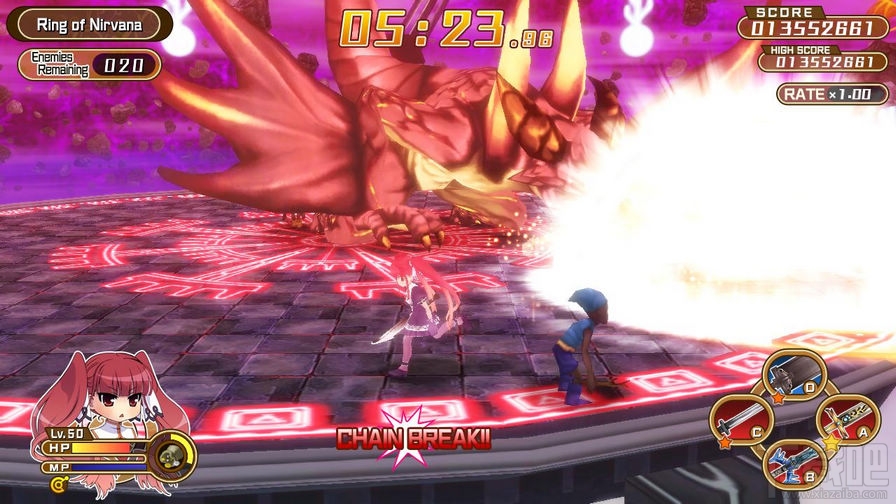 游戏的舞台就是一个大型的圆平台,击倒所有敌人向最深处前进,有各种各样的怪物和巨大BOSS,前进路上还有分支选择。游戏过程中可获取不同的武器,每种武器的必杀技都不一样。