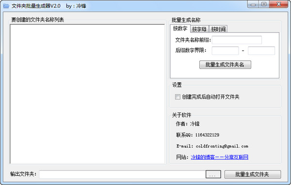 方便实用的文件夹批量生成工具,在软件左侧分行填写文件夹名称,下方选择路径,软件的右侧有更多文件夹批量生成的条件,比如按字母、时间、数字自动批量生成文件夹名字。软件不到1M,无需安装即可运行!软件基于.net开发,使用前请确定系统装有.net Frameword框架。