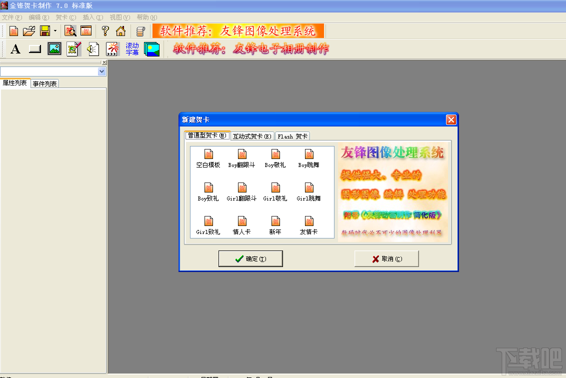5 KB/2020-08-17《金锋贺卡制作》可以方便的制作出要多酷有多酷的电子音乐贺卡。它可以将图片、文字、动画、flash等加入背景音乐制作成丰富多彩的贺卡。即可以生成独立运行的EXE贺卡,也可以制作生成Flash动画贺卡。金锋贺卡制作所特有的互动型贺卡制作,可以随意设置贺卡窗口的大小、形状、背景、背景音乐等,可以随意在贺卡窗口中插入或移除文本、按钮、各种图片、GIF动画、Flash电影,并可以设置这些对象在被单击时的动作,比如:提示相应信息、打开网址、更改其它对象的属性等,还可以让它们在执行相应命令的同时播放声音。