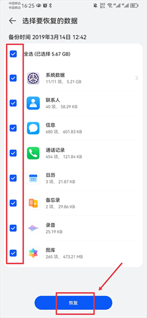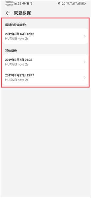 3、在恢复数据中的所有备份时间中,选择一个进行恢复。
