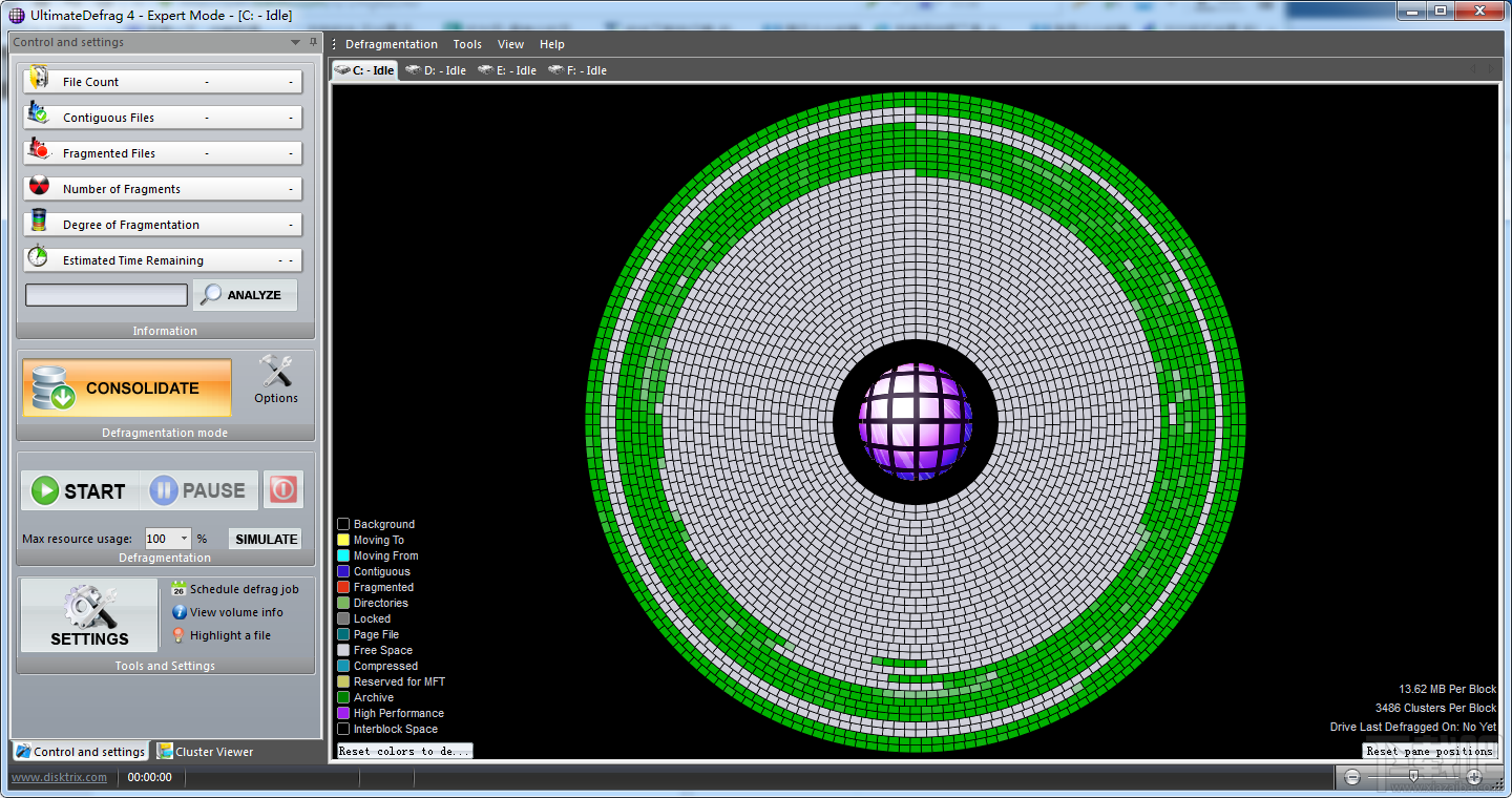 Ultimate Defrag 3 是 DiskTrix 公司出品的专业磁盘整理软件。和DiskTrix 公司的另外一个磁盘整理软件DefragExpress相比,DefragExpress像全自动相机,不需要文件或整理方面的知识,也不需要太多设置,使用起来简单快速。而 Ultimate Defrag 3 就像一个专业相机,可以调整和设置的参数很多,可以按照自己的习惯和偏好进行磁盘整理。