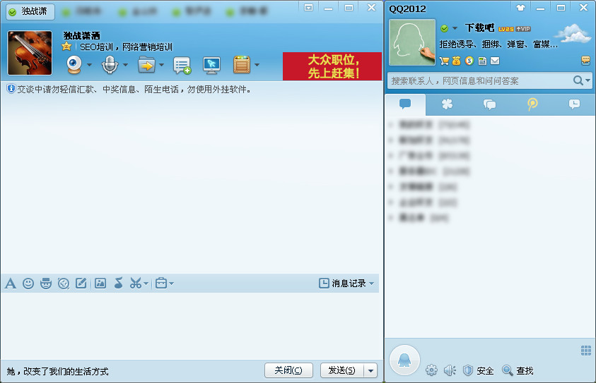 QQ2012正式版已发布,qq2012腾讯官方下载安装画面显示支持会话窗口合并功能,QQ2012可以将多个聊天窗口合并为一个窗口。此外,QQ2012新增历史与推荐表情,多人视频可同时支持20人视频聊天。