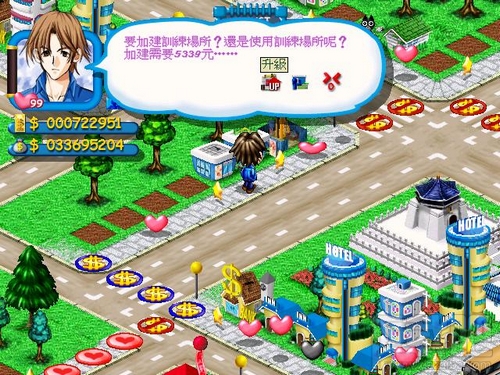 现在,钱对于各位玩家已经不是问题了,能力还有了一定的提高。如何去追求女主角呢?首先要在这里告诉大家,在求婚365日Ⅱ里面,玩家所选择的女主角是会出现在游戏场景中的,如果你的状态大好,而又在大街上碰见她,那么她就会更加喜欢你了;反之,就麻烦了,所以大家千万要小心。有时候碰上她心情好,就会帮你的建筑物升级,相反的,嫌你建得太丑,很有可能就把它给拆了。现在大家知道女人恐怖了吧。每逢星期一至星期三,她会提出三个条件,例如想要的礼物、某项能力高的人等,玩家们一定要投其所好,千万不要让她失望。如果成功,那么这个星期可以跟她约会的很有可能就是你。买礼物要去商店,大家要记住你只能放下一件礼物,千万不能多买,否则就旧的礼物就会被覆盖。跟我们熟悉的心跳回忆一样,当你成功跟女主角约会,就要回答她所提出一些简单的问题,这个我就不细说了,还是留给大家去思考吧。