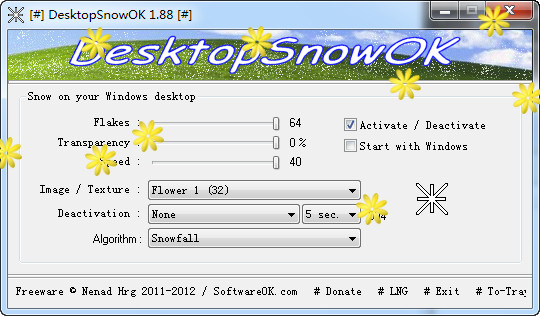 Desktop SnowOK是个没有任何恶意的小程序,可在你的桌面上呈现雪花纷飞的效果,你还可以自行调整雪花的数量,形状,颜色、大小和透明度等等。