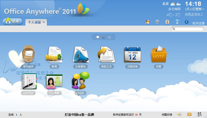 通达OA2011(品牌:Office Anywhere)是由中国兵器工业信息中心开发的协同办公软件,是国内最优秀的办公系统之一,通达OA2011软件从2001年开始研发至今,已有近十年的历史,通达oa办公系统软件从第一个版本到现在,历经二十余次核心升级,软件技术领先、功能强大、性价比高、开源程度高,并在全国OA软件行业中独家推出先用后买、不限用户、终身升级、开放源代码、不满意退款等重大举措。