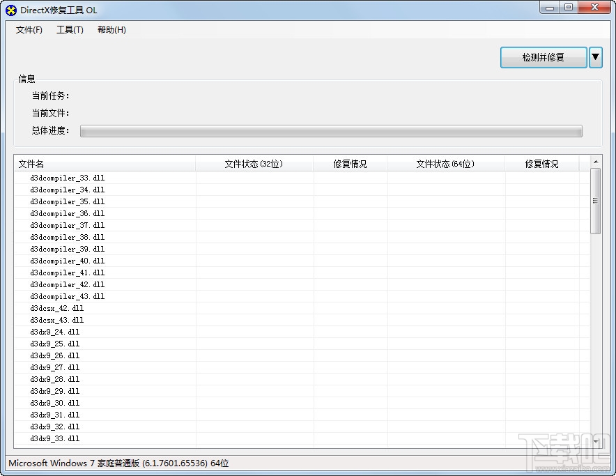 DirectX修复工具(DirectX Repair)为了应对一般电脑用户的使用,采用了傻瓜式一键设计,只要点击主界面上的“检测并修复”按钮,程序就会自动完成校验、检测、修复以及注册的全部功能,无需用户的介入,大大降低了使用难度。