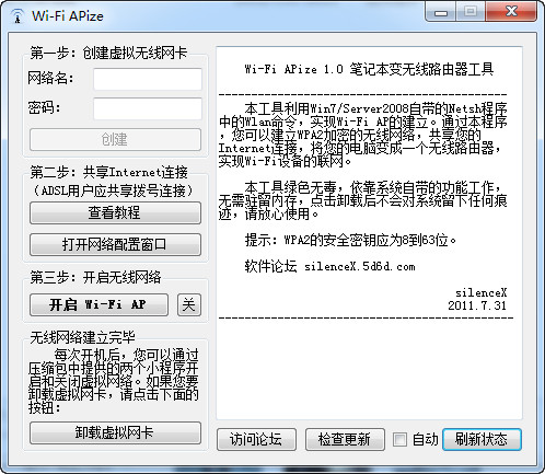 Wi-Fi APize绿色版(笔记本变无线路由器工具)利用Win7/Server2008自带的Netsh程序中的Wlan命令,实现Wi-Fi AP的建立。通过本程序,您可以建立WPA2加密的无线网络,共享您的Internet连接,将您的电脑变成一个无线路由器,实现Wi-Fi设备的联网。