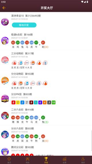 2、在开奖大厅当中,可以看到所有彩种的开奖结果,如果结果未出那么页面上也会给出相关的提示,比如“等待开奖”;