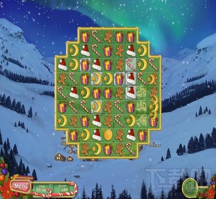 圣诞消除画面: 游戏画面由写实风格的精美2D图像构成。不仅多幅漂亮的雪景背景图交替变化另人心旷神怡。前景为消除区域,由各种可爱的圣诞物品组成。整体画面充满欢快的圣诞气氛,唯美中带有一份俏丽。