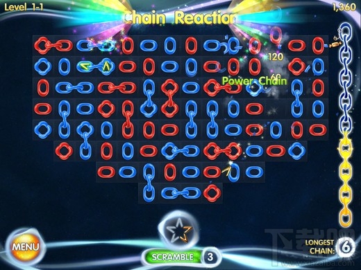 游戏的玩法简单,上手容易。扭动并旋转其中的一个环节,匹配相同颜色的链条,使之组成3个或更多相连的直线即可消除。通过消除累计能量,填充满画面右侧的金色链条即可过关。