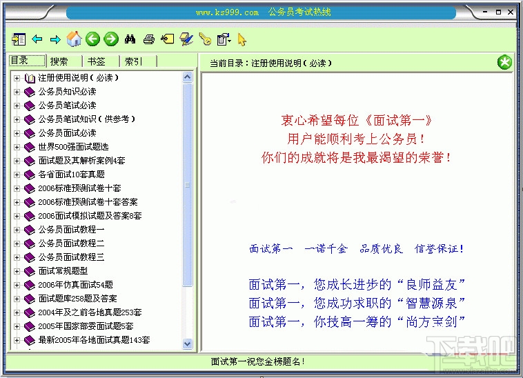 做中国较好的公务员面试软件! 口号:面试第一,一诺千金,物超所值,信誉为本!说明:面对强手如林的公务员考试,最重要的事情就是不断用知识武装自己!让公务员面试软件来帮助您顺利通过面试并取得最终的胜利吧!锁定公务员面试,将宝贵的人力、物力、财力用在最正确和最重要的地方,您一定能够成为一名技高一筹、最终获胜、金榜题名的面试高手!
