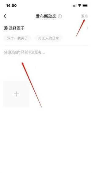 4、登录成功既可进入发布页面,在空白处输入个人经验和想法,点击右上角【发布】即可完成。