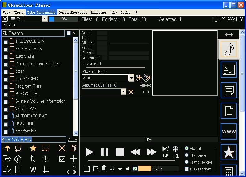 Ubiquitous Player是一款多种功能于一身的电影/音乐播放器、文本编辑器和图像浏览器。支持现在流行的格式:例如BMP、ICO、WMG、EMG、JPEG、JPG、PNG、GIF、HTML、MHT、MPG、MPE、AVI、WMV、WMA、ASF、MP3、WAV、PPL、MOV、PDF。