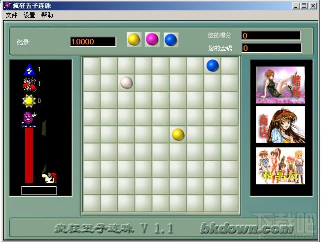 疯狂五子连珠很难得到高分??这个版本的五子连珠增加了很多功能,你可以保存进度,并且可以去商店里购买闪电,炸弹等宝物,钱不够了也可以去赌场赌钱,这下可以在办公室里打发时间了……