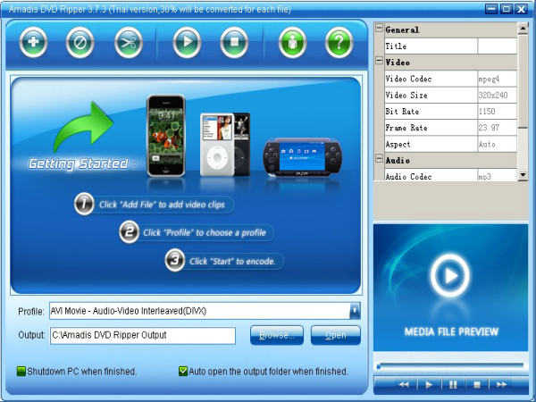 Amadis DVD Ripper主要功能包括:复制DVD到VCD,使用MPEG1编码;复制DVD到SVCD,使用MPEG2编码;复制DVD到AVI、DivX、Xvid,并且支持其它编码格式;输出文件更小,提供高质量的视频音频;转换完成之后能够自动关机;转换过程中提供预览;界面友好,支持换肤;可自定义输出文件尺寸;支持自动分割输出文件以便刻录到CD-R;支持选择字幕和音轨;支持去除Macrovision防盗拷;支持复制防盗拷的DVD。