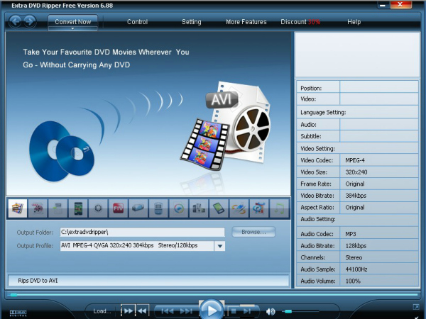 Extra DVD Ripper是一款易于使用的DVD格式转换软件,可以将DVD盘上的电影快速转换为avi, mpeg,iPod(MP4), iPhone, Apple TV, flv(YouTube), Sony PSP, Sony PS3,wmv, Microsoft Zune Player, Pocket PC, Mobile 3gp。