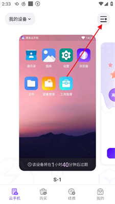 1、打开章鱼云手机,点击右上角的三横按钮。