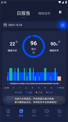 报告包含睡眠质量评分、入睡时间、醒来次数等多项指标,简单易懂。