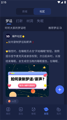 蜗牛睡眠安卓版采用先进的睡眠监测技术和算法,带来准确、可靠的睡眠数据分析,除了基本的睡眠监测,还有梦话、打鼾、呼吸健康等多方面的功能,为用户提供全方位的睡眠健康服务。