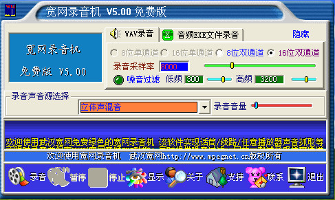 宽网录音机是武汉宽网公司开发用于实现不限时WAV录音工具软件,同时该软件提供频谱显示、声音波形显示等功能,是一个非常有效的WAV录音工具。同时该软件提供录音选择回放及裁减保存、通道及采样率任意选择、频谱显示、立体声音波形显示及噪音滤波等功能。