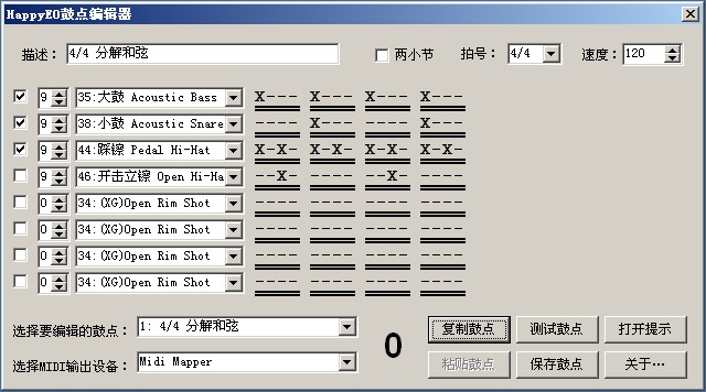 HappyEO鼓点编辑器是一款编辑打击乐器(各种鼓)软件。 用它可以自己编辑和学习各种鼓(打击乐器)的节奏,内部预置了十几种在《HappyEO电子琴》中的节奏。 HappyEO鼓点编辑器是完全免费的软件,没有任何功能限制。