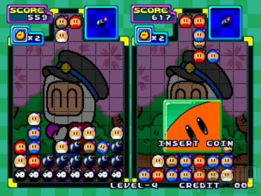 炸弹人方块游戏是以 1994 年在 PC-ENGINE SUPER CD-ROM2 主机上推出的同名作品为基础所改编,是一款以著名游戏角色“炸弹人”为主题的益智对战方块游戏。游戏规则为将同色的炸弹人方块 3 个以上排成一列,即可消除该方块,并能引爆出现在画面上的炸弹来消除不断升高的砖块,如画面被砖块填满,就算挑战失败。游戏除了单人模式之外,并支持最多 4 人的无线分享联机对战模式,玩家只需要具备 1 套游戏,即可以无线传输方式分享给另外 3 名 PSP 玩家,一起进行对战游玩模式。