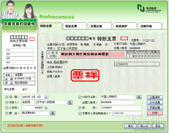 华君支票打印软件提供了非常方便的解决方案,支票的各个填写项,都可以先前录入,做到一次输入多次使用,在图形化的界面下,用户只需要点几下鼠标,就可以填好一张支票内容,打印字迹的位置调整更是方便,只要点击调节方向按钮就能精确的调节好打印位置,进行打印。打印完毕后,可以灵活的查询以前打印过的支票明细,为支票的后期管理工作,提供了方便。
