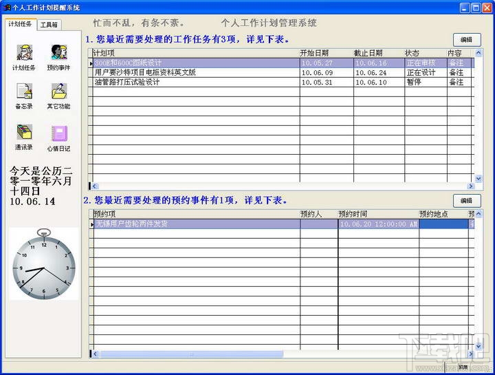 每年下来,明明处理了无数的大小事情,写工作总结时却怎么也想不起曾干过那些事情!这些情况都是办公人员常发事件,当时能处理的还行,一遇到当天不能处理,几天后还要记得解决的事情,预约几天后要处理的事情有时就会忘的死死的,以致出了漏子才后悔莫及。如果有上述情况,那么,您需要这个虚拟秘书《个人工作提醒系统》的帮助了。