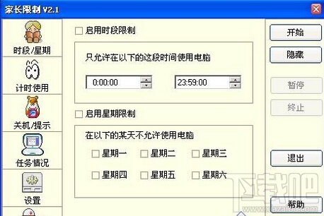 现在有不少的家长都为自己的子女添置了电脑,在促进孩子学习的同时也希望他们能掌握一门技术。但有些家长发现,自己的孩子总是把电脑当成一部高级游戏机,且难以制止,于是就有限制孩子使用电脑的想法。[家长限制]就是为这些家长而设计的。新版的[家长限制V2.1]有以下功能:1.设定电脑只能在某段时间使用,例:只能在7:00-22:00这段时间使用电脑。2.设定电脑在一周内哪天能使用,哪天不能使用。因为有从孩子角度考虑过,星期天不能被限制。3.每一段时间做便运行强制休息屏,让限制对象不得不休息,强制休息屏过了一段时间(可设)后会自动解开。这项功能就是让孩子每过一段时间便休息一段时间4.电脑运行一段时间后便自动关机,但为了让这项功能更好地发挥,需配合“关机后若干分钟内不许开机或“关机后便不许开机这两个功能使用。5.安排在某时间或若干分钟后显示一段文本信息。6.安排在某时刻或若干分钟后关闭计算机。
