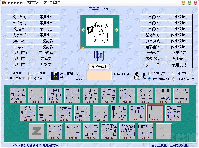 五笔打字通是专门为五笔初学设计的,它操作傻瓜化,不用看帮助文档就可上手,独有的空心字提示非常直观,设计的存档功能,可以接着上一次练习继续学习,在文章练习中,按回车就可以得到帮助,从此不用再去问老师和同学某个字是如何拆字,无论是对于五笔初学者学习还是教五笔的老师的教学工作来说,这款软件都让大家很省心,下载使用五笔打字通都是很实用的,很有价值的! 对于五笔初学者而言,最头痛的就是汉字如何拆分,有了五笔打字通,你就不用为汉字如何分解为五笔字根,即五笔拆字操心了,因为它会手把手地教你如何拆分,每敲击一下键盘,就会同时提示汉字编码,五笔字根拆分(详细拆字图),要敲击的键位。 软件功能有:五笔字根练习,常用字1至4练习,键名字,成字字根练习,非常用字1至3练习,二字词组,三字词组,四字词组练习,文章练习(文章练习中包括有中文练习,英文打字,数字练习),打字游戏(包括中文汉字练习,数字,符号练习),自由录入。 在文章练习中,五笔游戏中可以测试打字速度,速度快的可以上五笔英雄榜。 软件自带的五笔编码查询功能(可以拼音或笔画查询),可以让你查询6700个汉字的的五笔编码和五笔字根拆字图;软件中的文章练习也同时提供拆字图,有不会打的汉字,你就不用上网去查询,也不用去问同学和老师了。 五笔打字通自带有五笔简明教程,短小的文章让你快速入门,你不用再买本书去学五笔了。简明五笔教程中有五笔字根表和口诀,可以打印。 如果金山打字通不能很好地帮你学习五笔,下载五笔打字通绝对没错。这个软件现在可以免费使用,可以不用注册就在线使用。它应该是目前最实用的的五笔打字练习软件了! 此版本为自解压安装包,卸载软件只要删除快捷方式和安装目录即可。